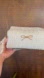 Chic cream colored cosmetic, makeup, or anything bag with a gold bow detail and pearl-like zipper pull. Elegant ripple soft faux leather. Measure 9 x 5 x 5 inches. Brand new with tags.