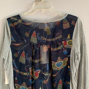 Colorful flowy tee with colorful, vibrant design navy front & accented grey side/sleeves. Ideal for casual outings