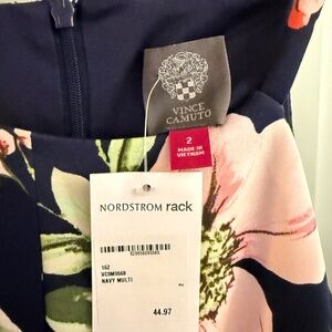 Beautiful Vince Camuto  dress - navy base with flowers. Discreet side pockets. NEVER WORN - Tags on dress.