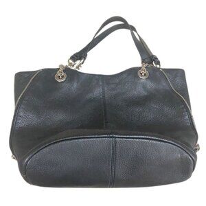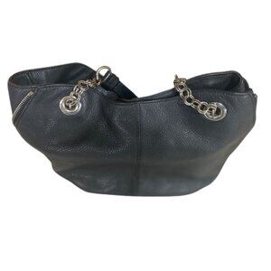 This beautiful hobo style handbag is a must-have for any fashion-forward woman. Crafted from genuine black leather, this medium-sized bag boasts a pebbled finish and silver hardware. The bag features a magnetic closure, side zippers for more purse square footage, and double handles with a 9" drop.