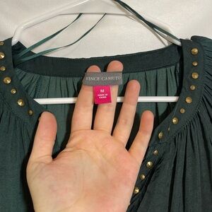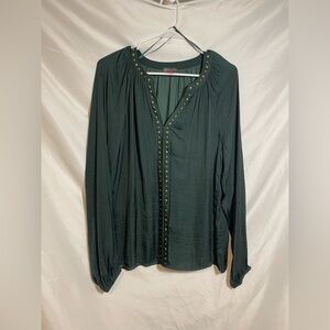 Chic dark green blouse with studded accents. Long sleeves and elegant design. Perfect for versatile styling.