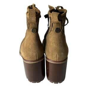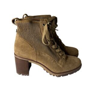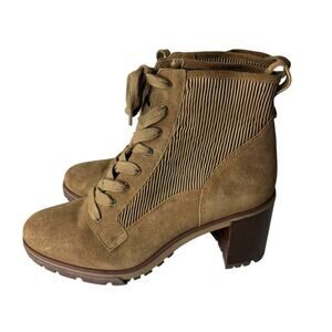 Vince Camuto Donna Lace Up Heeled Hiker Bootie in Sandy Brown. Size 11. Features round toe, block heel, suede upper, ribbed panel, pull tab, and lace-up closure. Excellent pre-owned condition.