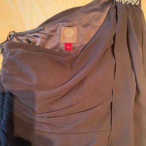 Sparkling rhinestones and draped fabric accent the stunning one-shoulder silhouette of this Vince Camuto gown.