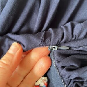 There is a small area where the zipper caught on one of the ruched folds. The zipper is on the side and the tear is hidden under the fold