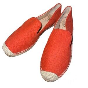 Step into effortless summer style with these stunning Vince Camuto orange embossed leather espadrilles. Featuring a chic snakeskin pattern, woven jute trim, and easy slip-on design, these flats combine comfort with high-end sophistication.