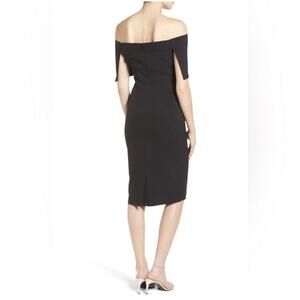 Elegant black off-shoulder cocktail dress with a fitted silhouette.