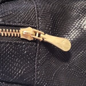 This stylish black clutch features a sophisticated textured design, perfect for any occasion. Its sleek look is enhanced by a subtle gold accent, making it a versatile addition to your accessory collection.
