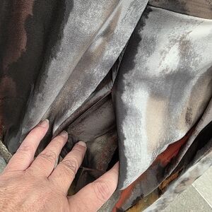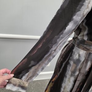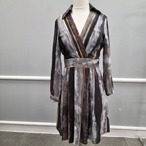 Chic wrap dress with a mix of colors. Features long sleeves and a belted waist.