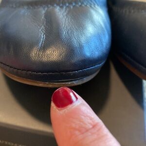 Perfect flats for everyday wear. Soft leather, elastic around the sides. Minor detachment of sole and upper. Very minor! Lots of life left in these. Comes in original box.
