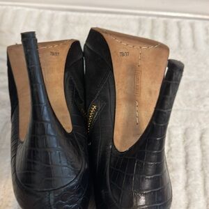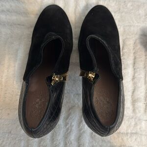 Vince Camuto Elvin Suede Platform Bootie With Crocodile Leather Heel and gold zipper