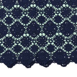 "An inky-blue overlay of crochet lace pops against the mint-green background of a slim skirt ending in a pretty, scalloped hem."