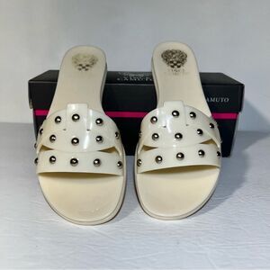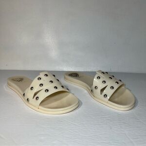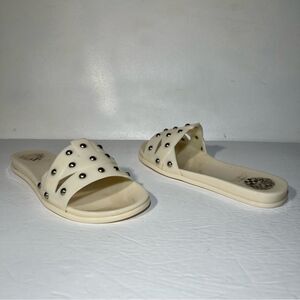 Crisscross banded upper, domed studs, open toe, slip-on style