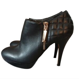 These chic black ankle boots by Vince Camuto are crafted from smooth leather and feature a stylish quilted design that adds depth. The gold zipper on the side enhances both functionality and elegance, while the high thin heel and platform sole provide a sophisticated silhouette.