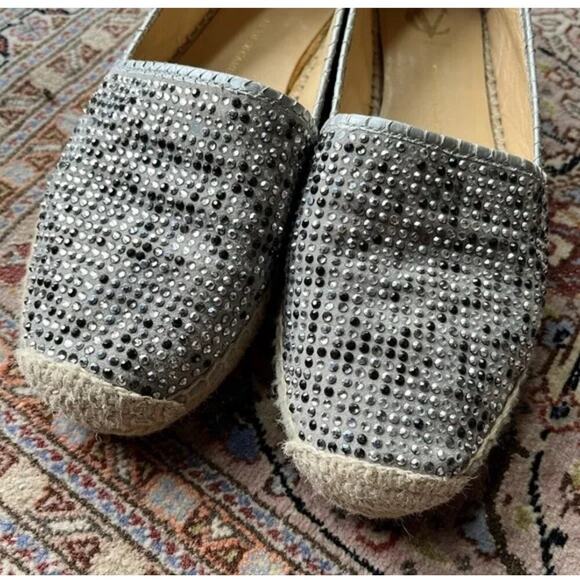The product is a pair of Vince Camuto espadrille flats in size 9 for women. These silver colored flats feature a synthetic upper material and have a stylish flat design. Perfect for adding a touch of elegance and comfort to any outfit, these shoes are a versatile and fashionable choice for any woman's wardrobe.
