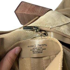 Vince Camuto Eyana Suede Over-The-Knee Boots. Size 7. Features almond toe, stacked block heel, suede leather upper, synthetic lining, rubber outsole, and side zipper closure. Style VC-EYANA. Excellent pre-owned condition.