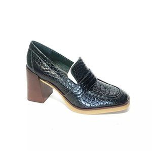 Elevate your shoe game with these stylish Vince Camuto Ezerna Platform Heel Loafers. The green leather upper material with animal print pattern and square toe shape make for a chic and trendy addition to any wardrobe. Slip on these ultra high (4 in & higher) heels with ease and enjoy the non-slip features of the rubber outsole material. Perfect for both casual and business occasions, these heels are a must-have for any fashion-forward woman. The block heel style adds extra comfort to your stride and the M shoe width ensures a perfect fit. Made in Brazil, these shoes are of the highest quality and will last you many seasons.