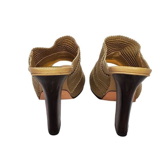 Vince Camuto Fabric Straw Slide Heel Sandal 9 Open Almond Toe Tan Wood Look Heel