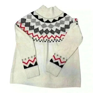 Vince Camuto Fair Isle Mock Neck Scandinavian Winter Style Sweater Size Small. Excellent used condition. Stylish white sweater with geometric patterns. Features red, black, and gray accents. Perfect for chilly days.