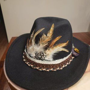 Custom hand made hat. Vince Camuto brand. Queen Petty is what I call this one, as it reminds me of the King, Richard Petty's hat style! One of a kind design. Beautiful Tiger Eye heart gem stone, quail feathers and a hand braided band adorn this western style hat. Hat is black with cream and dark brown accents. Perfect for concerts or a night on the town. Hat is brand new with tag attached. One size, hat has an adjustable draw string inside the band for the perfect fit.