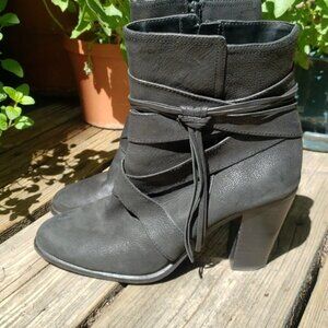 Stylish. Boho style. Amazing black textured leather. Criss cross straps with fringe/tassel. Wooden blocked heel. Interior zipper for easy fit. Leather upper. Textile lining. Man made outsole.