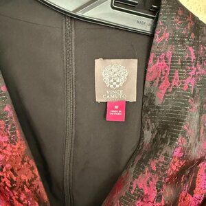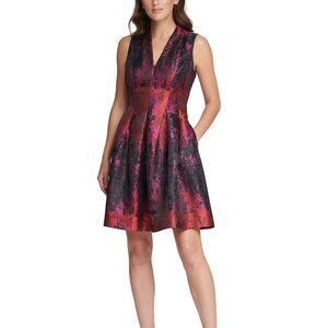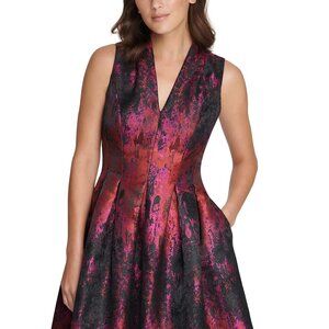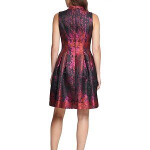 Bright red-orange with brilliant flames of color flickering through the waistline's released pleats