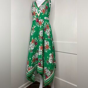Vince Camuto Floral A line Handkerchief Green V-Neck Dress