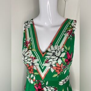 This sleeveless sundress by Vince Camuto features a vibrant green base adorned with pink floral prints, perfect for a wedding guest or cocktail occasion. The V-neckline and high-low hem add a touch of elegance, while the lightweight fabric ensures comfort in warm weather