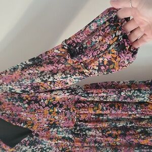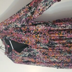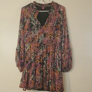 Vince Camuto mini dress size large. All over tiny colorful floral print. Tiered mini dress. Sheer longsleeves. Good pre-owned condition. Approximate measurements provided. Wedding. Party. Date Night. Business Casual. BoHo.