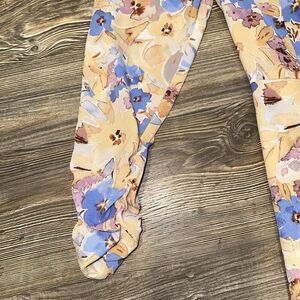 This beautiful Vince Camuto midi dress features a stunning floral pattern and a V-neckline with a crossover design. The dress has long ruffled sleeves and a cascading ruffle hem for added volume. The overlay at the front and the layered chiffon fabric add texture and elegance to the dress.