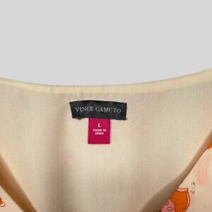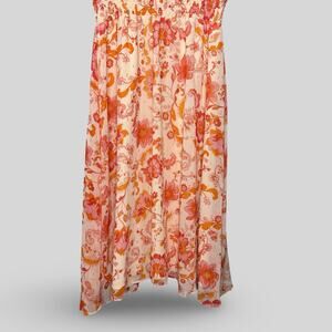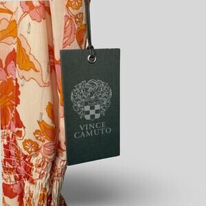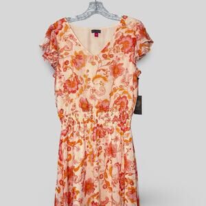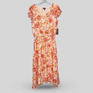 Vince Camuto v-neck floral midi dress in radiant orange. It has flutter sleeves and subtle metallic details throughout.