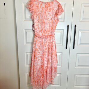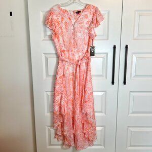 Vince Camuto Flutter Sleeve Belted High-Low Maxi Dress Pink Orange Floral NWT