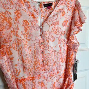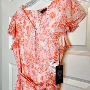 Elevate your wardrobe with this stunning Vince Camuto belted maxi dress, new with tags. Featuring a vibrant pink and orange abstract floral print, this dress offers a feminine and flattering silhouette with flutter sleeves, a belted waist, and a flowing high-low hemline. Crafted from lightweight 100% polyester with a full lining for comfort, it’s perfect for weddings, garden parties, vacations, or special occasions. The back zipper closure ensures an easy fit, while the delicate ruffle details add a romantic touch. Machine washable for easy care.