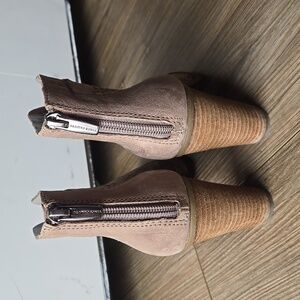 Vince Camuto Frasitta Leather Cut Out Wooden Stack Heel Booties in excellent pre-owned condition.