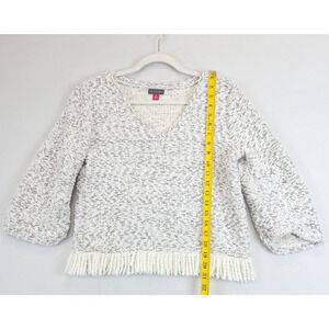 Vince Camuto Fringe Trim Textured Sweater Women XS V Neck White Black Cozy Knit