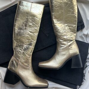 A tall boot is a must in every fashion lover’s closet and we’re loving the sleek Sangeti. The versatile boot is styled with a square toe, flared block heel and seam details. Choose from neutral hues or a statement metallic gold finish. Wear your pair with a minidress for an effortless summer look.