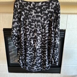 Beautiful, gently used Tunic with substantial polyester material and ruching. Multi colors: grey, black and white.