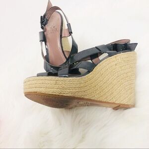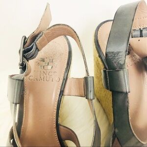 Vince Camuto gray patent leather strap wedges size 7 1/2 B some of the threading on the inner foot is scraped but overall in fabulous condition see photos for more details(S138)