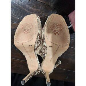 Turn heads in these bold Vince Camuto slingback platform heels, designed in a chic snakeprint finish. Featuring a peep-toe front, adjustable slingback strap, and high stiletto heel, these heels strike the perfect balance between fierce style and feminine elegance. The platform sole adds stability and comfort while elongating your legs for a flattering silhouette.