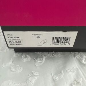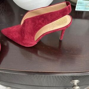 Never worn, with tags still attached, these pull-on shoes feature an elastic back and a burgundy red suede heel.