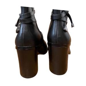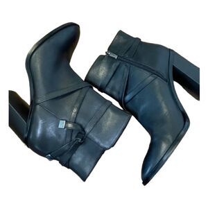 Vince Camuto Ankle Boots in Black Leather, they have a Stacked Heel, a Side Zipper Closure and Leather Strap Belt Wrapped with Silver Tone Metal Buckle around the boot with a Tassel. It is great for casual days at work, school, date night, night out with the girls, and Family Dinner. It would make a great Christmas Hanukkah Valentine’s Day Birthday or any Holiday gift!