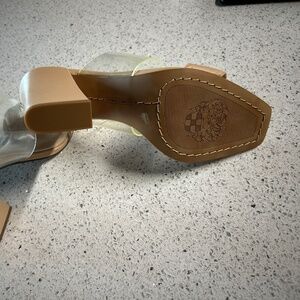 Vince Camuto Felima Sandals feature a square toe, a clear lucite strap across the top of the foot, and a tan leather toe strap. Never worn!