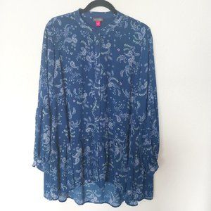 Vince Camuto, high low, blue floral paisley print, long sleeve, button down, tunic blouse. Excellent, like new condition.