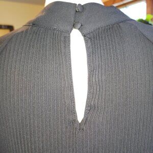 25542. Vince Camuto High Neck Pleated Black Georgette Crepe L/S Tunic Blouse features exquisite flowy design with cleverly executed accordian pleating to both reveal & conceal as it skims the body to the hips. So beautiful in it's simplicity, semi sheer fabric ends in a subtle flounce at bottom hemline, fabric covered buttons at the cuffs create an elegant sleeve. In pristine condition...looks to have never been worn. In Black. Size 2X.