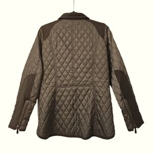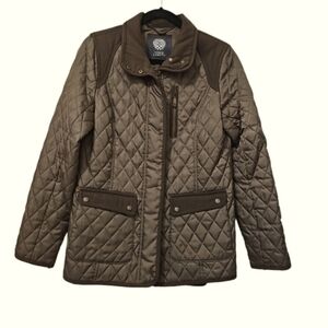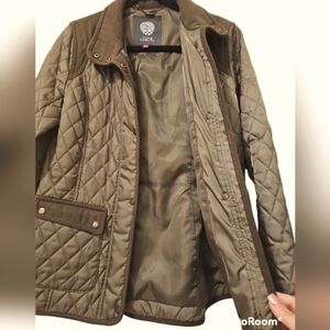Vince Camuto olive/hunter green quilted coat with wool trim detail throughout, size medium. In excellent condition (no longer have hood).