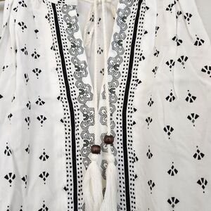 Add a touch of boho charm to your wardrobe with this Vince Camuto ivory sleeveless top, featuring a chic printed design and tassel-tie neckline. The lightweight fabric drapes beautifully, while the intricate border print and embroidered front panel bring an elegant, artisanal feel. Perfect for pairing with denim, linen pants, or skirts for a relaxed yet polished look.