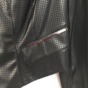 Gorgeous faux leather perforated collarless blazer. Cute metal bars on top of pocket flap still have protective stickers attached. Add style to your out fit with this jacket over jeans or over dresses!