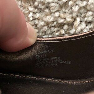 These are the Kanary style heels by Vince Camuto. They are in a beautiful dark bronze color. They are slip-on and have a peep open toe with a studded bow detail. They have a stiletto heel. They would be perfect for any formal occasion. They are in excellent pre-owned condition with no holes or stains. There is a tiny cracking flaw to the outer toe on one shoe as shown in photo. Box is included. Bundle with other items from my closet to get the most out of shipping!