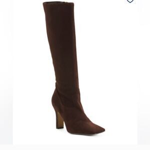 Vince Camuto Kalinder knee high suede boot in root beer brown. size 8 NWT. lightly padded footbed and anti slip sole. Square toe, side zip closure and 4" heel