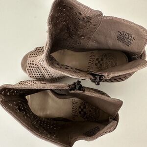Vince Camuto Kamey Tan Taupe Suede Laser Cut Open Toe Tie Tassel Zip Booties 5.5