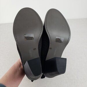 Slip on peep toe heeled booties. Black nubuck leather perforated fronts and solid backs. Stacked black heel. Airy low sides. Heel measures approximately 4.25”